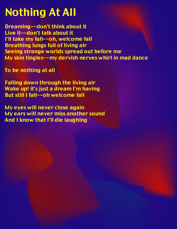 Welcome to my new and improved (?) lyrics section. It is my hope that my lyrics stand alone as poetry--I leave it to you to decide. I also wanted to share my lyrics with visitors in a way that would be appealing to the eye, so I have created lyric sheets using Adobe Illustrator. These are jpeg images and can be viewed or even downloaded for your reading and staring pleasure. I have not yet created graphics for all my lyrics, although I hope to do so in the weeks ahead. For now clicking on any of the links below marked with an asterisk (*) will take you to these new lyric pages.